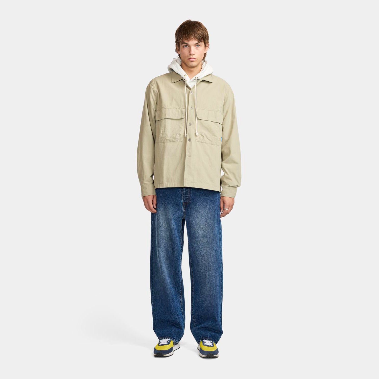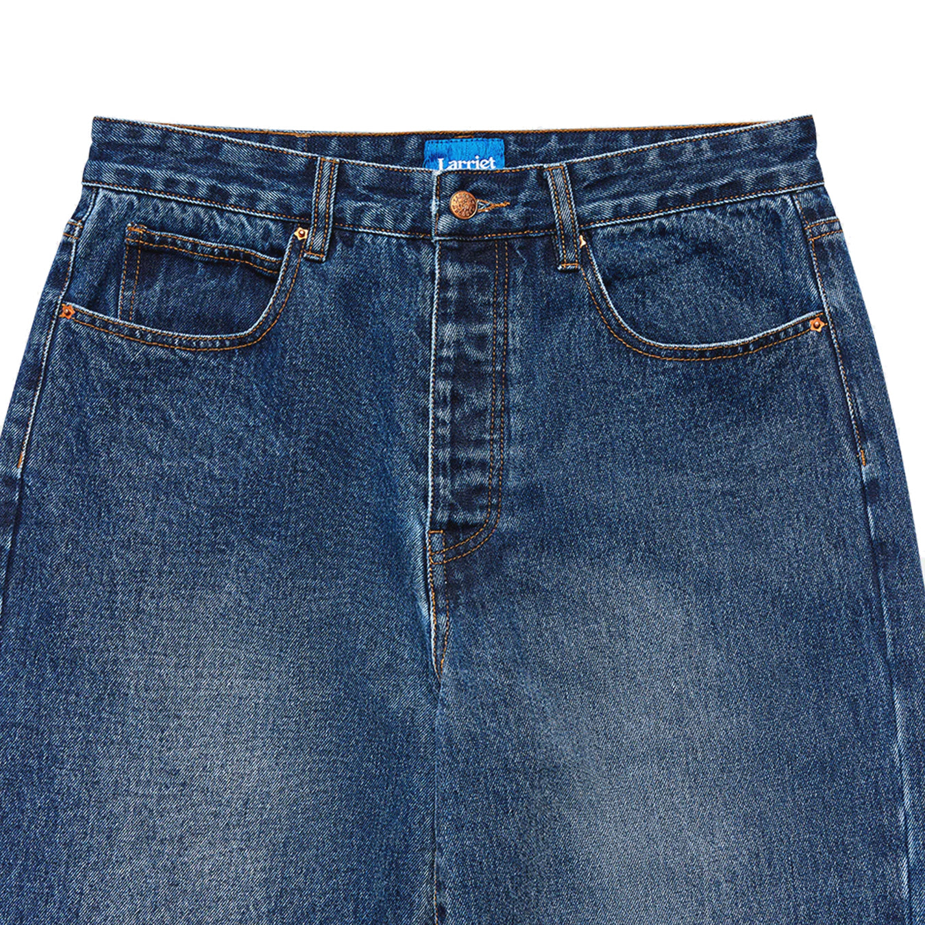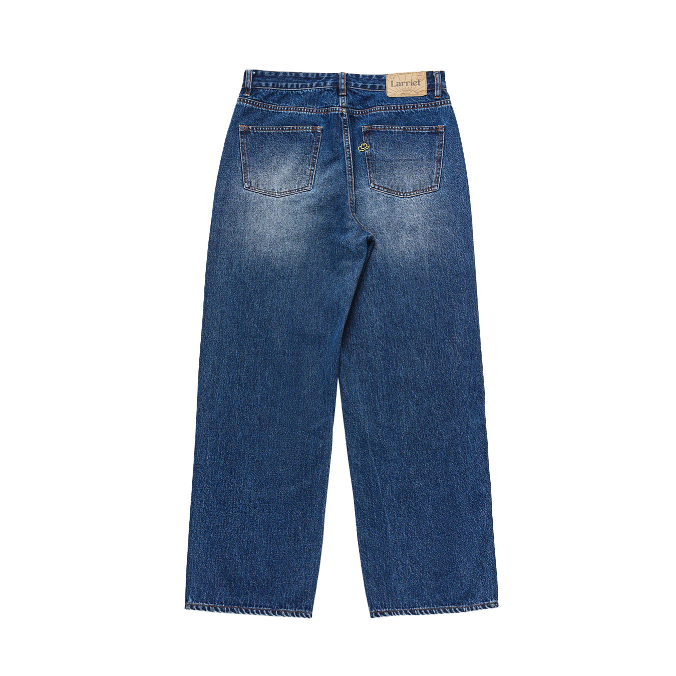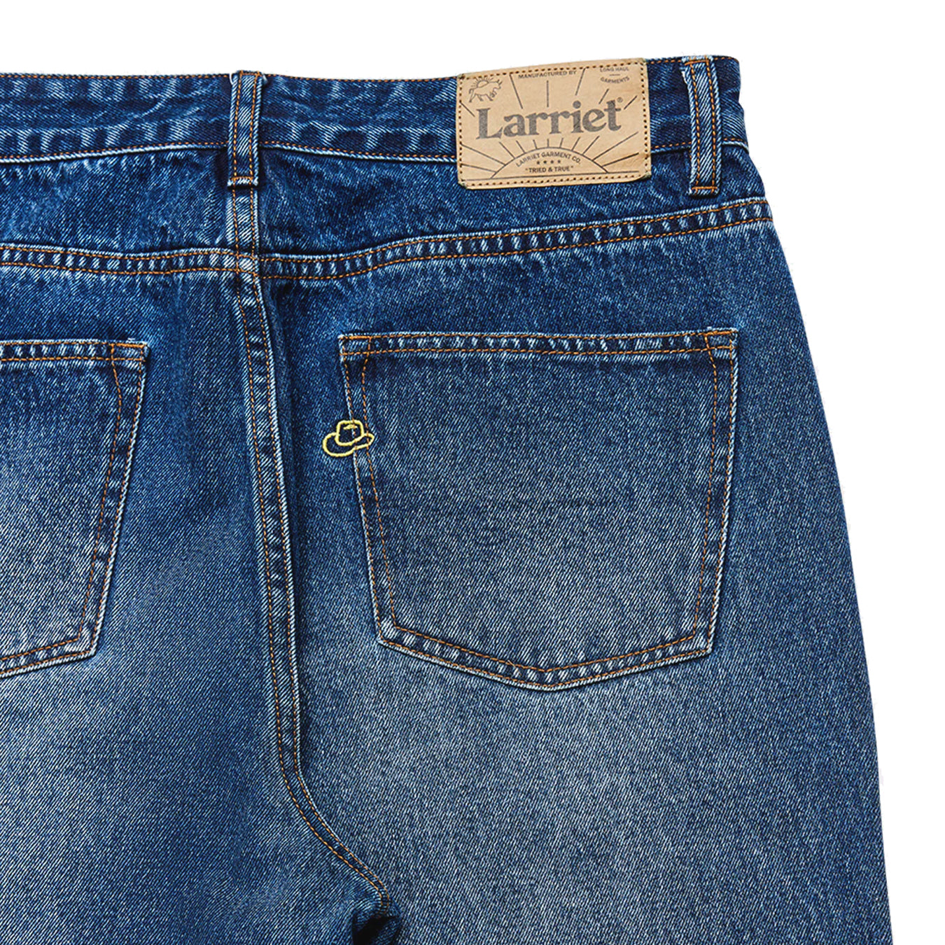 The Wale Jean is a wide-fit jean, crafted from heavyweight washed blue denim. The rear pocket features a cowboy hat embroidery. Designed with a button fly with Larriet shanks for secure closure and a classic 5-pocket construction. Finished with a Larriet Sun paper label on the waistband. Male model is 6'2" tall with a 32" waist and wears a size 32.