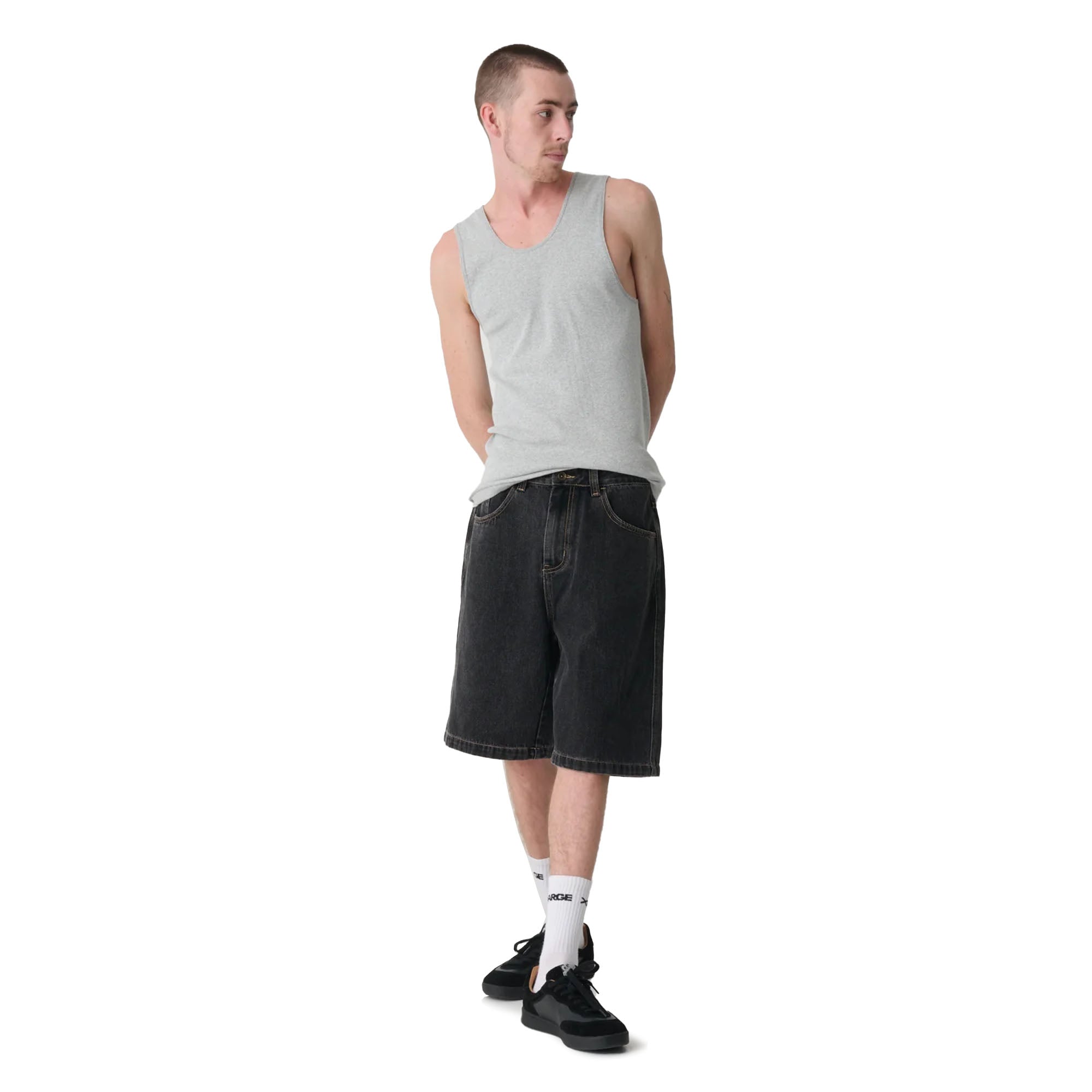 The XLarge Bull Denim 91 Short is constructed from a washed denim with an extra wide cut leg. It features an oversized waist with an extended rise and roomy thigh.