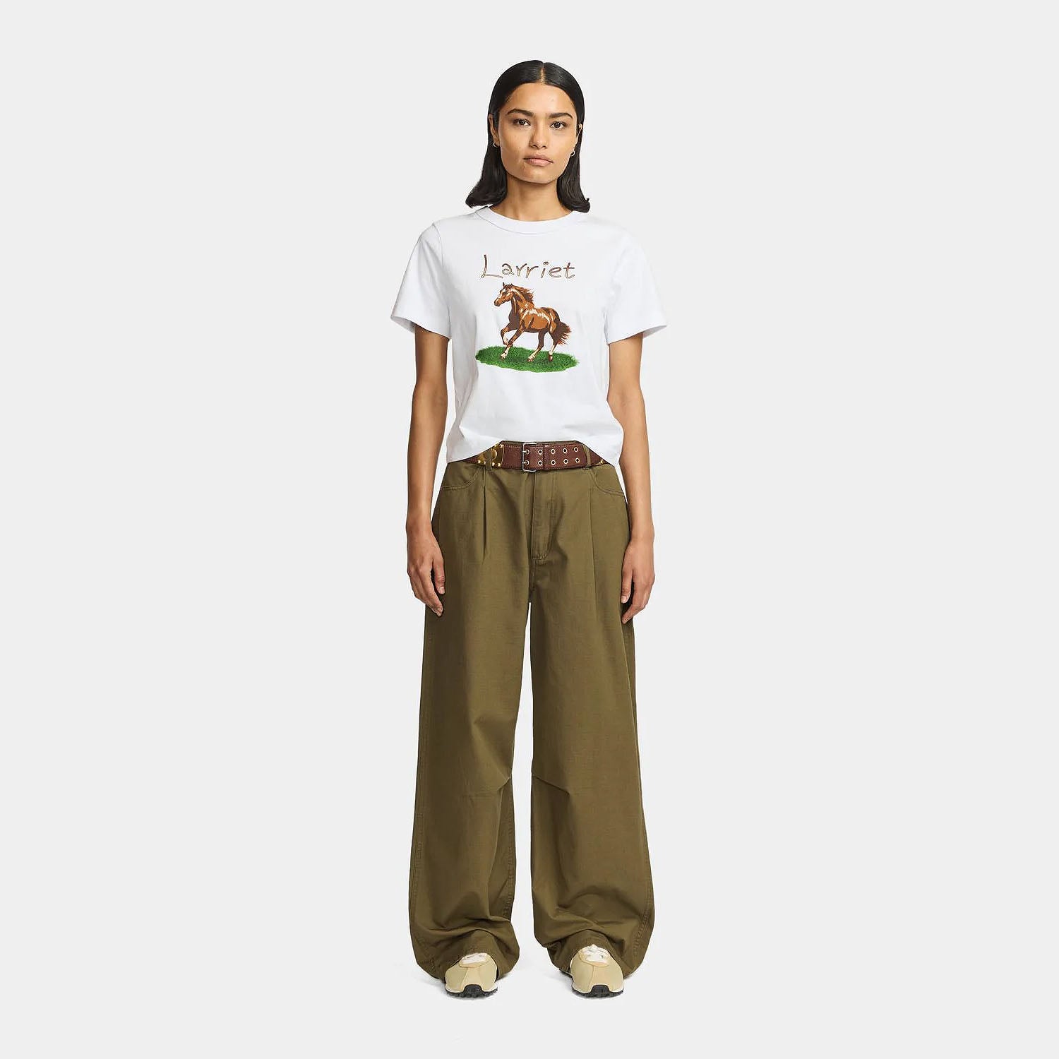 The Larriet Women's Vivian T-Shirt is a heavyweight t-shirt made from 100% cotton jersey with a chest print. This classic, relaxed-fit t-shirt is built to last, crafted from hard-wearing 32 singles jersey and pre-shrunk to maintain its shape. It features twin-needle stitched sleeves and hem, along with shoulder-to-shoulder interior neck taping.